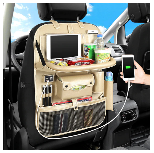 Еще один любопытный органайзер с подстаканником и портами для зарядки.