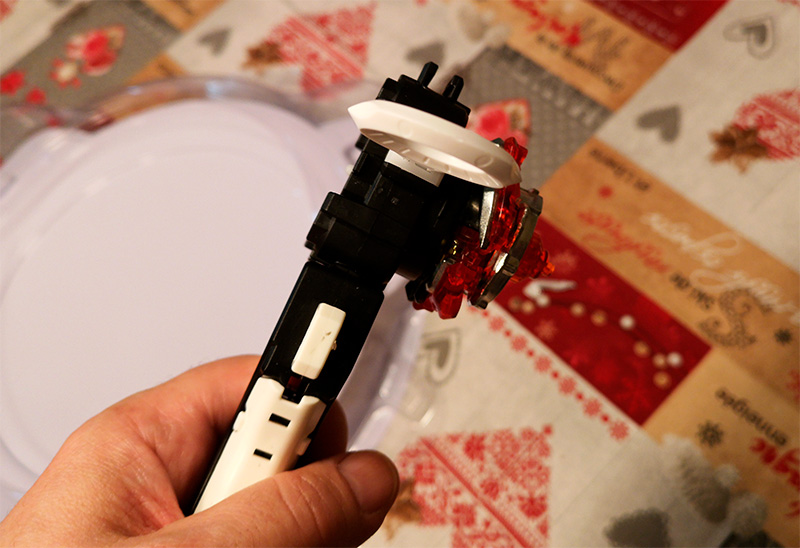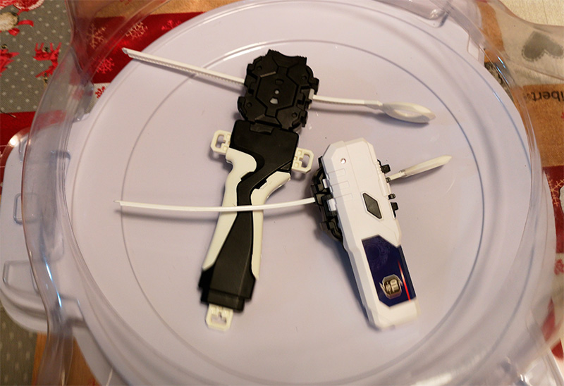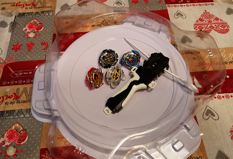 Вот как это все выглядит. Арена, боевые волчки (вообще в наборе их шесть) и пускач (тут один, но в наборе их два, потому что в этой игре сражаются один на один).