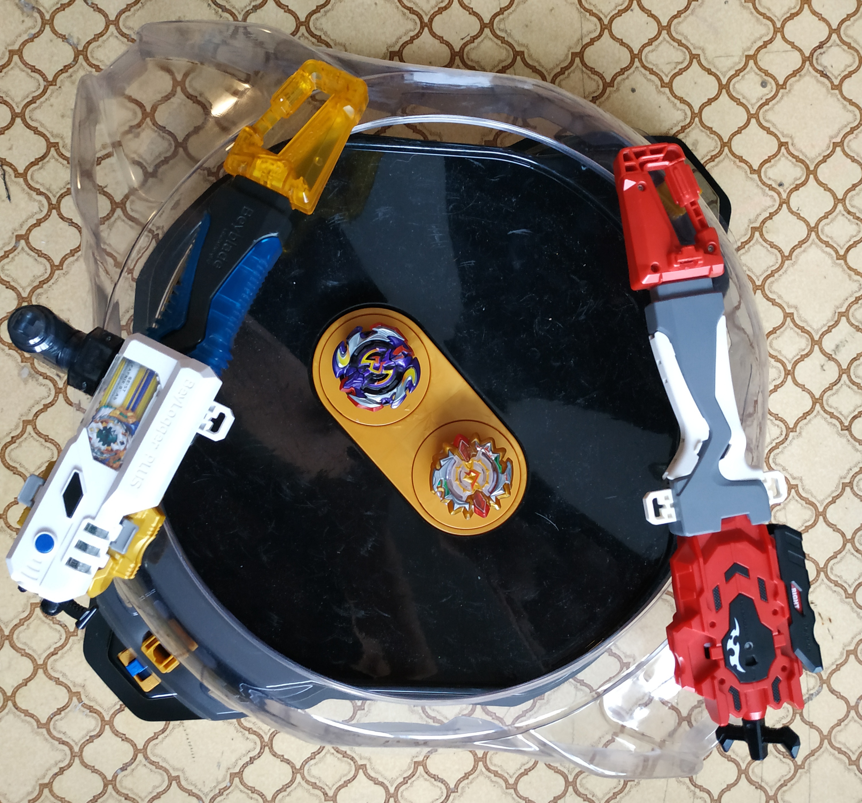 Волчки устанавливаются над ареной, на счет "три" выдергивается лента - волчки, бешено вращаясь, падают на арену и начинают сражаться друг с другом. Далее несколько вариантов. Оба целы и какой-то остановился раньше - выигрывает тот, что продержался дольше. Второй вариант - оба целы, но какой-то улетел за края арены (там два варианта конфигурации с помощью прозрачной крышки). Третий вариант - один волчок раздолбал (разобрал, на самом деле, можно же обратно собрать) другой волчок.