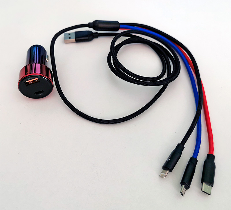 Еще приехал автомобильный адаптер Baseus, который поддерживает QC3, QC4 и PD, и может заряжать на мощности до 45 Ватт. Плюс он вольтаж показывает - прикольно. Подключил к нему Xiaomi Mi 9 - сначала адаптер выдавал всего 18 Ватт. Но это по обычному USB. Подключил кабелем Type-C - Type-C - выдал положенные 27 Ватт. Супер! Ну и еще взял два универсальных кабеля Baseus на три головки - в машину и для зарядки всяких устройств в гостиной. У меня один есть - брал для компьютера, и мне очень понравилось, что тут каждая головка - своим цветом, не перепутаешь. До этого был аналогичный кабель с черными головками - этот цветной явно удобнее.