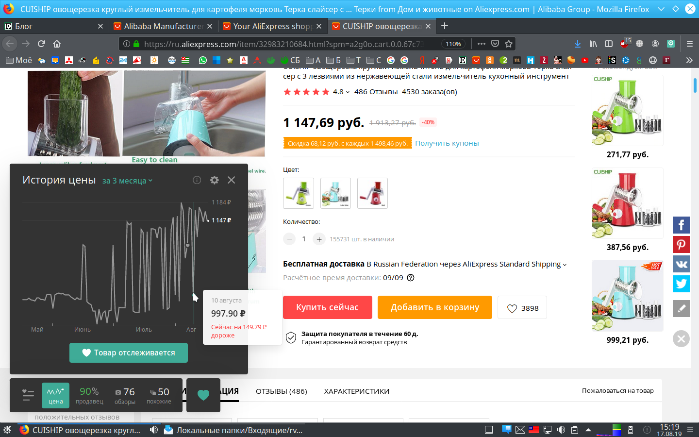 Захотел тоже купить тёрку как у Алекса. Захожу смотрю, вижу такую картину. Цена скачет как блоха. И не то чтобы сильно большая разница в 200р, но заел спортивный азарт, как поймать наименьшую цену? Ну или во всяком случае у нижней границы? Вот было бы что-нибудь как на бирже, назначил желаемую цену, упала ниже - автоматом купили. Может какая прога-скрипт уже есть на этот счет? Или тупо на алишку чаще заходить?