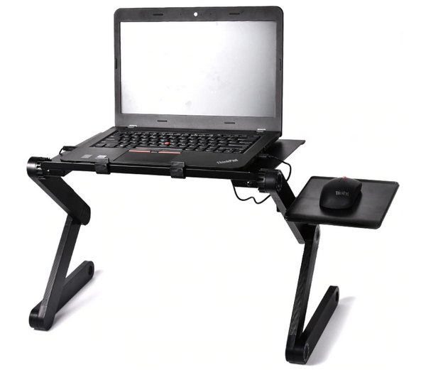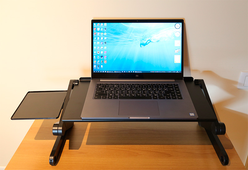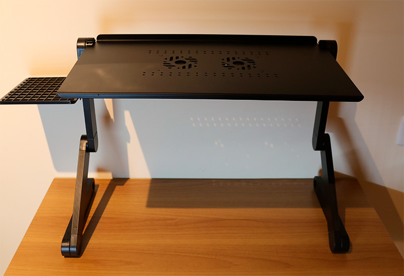 Вот она. Трехсекционные ножки с каждой стороны поворачиваются как угодно и фиксируются: вы можете настроить высоту в различных пределах и также настроить наклон ноутбука - и закрепить это.