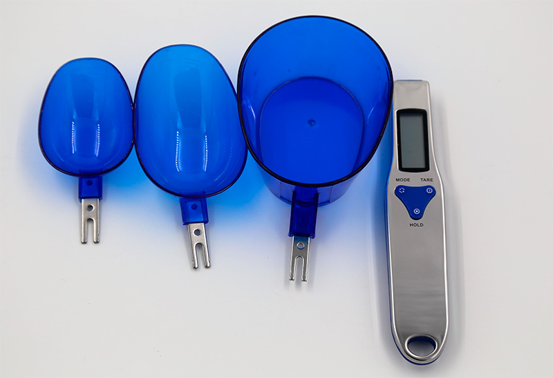 Ну и еще одна интересная кухонная приблуда - ручные весы с тремя разными емкостями, 535 рублей. Вставляете нужную емкость, что-то туда кладете, засыпаете или зачерпываете, нажимаете кнопку Tare - получаете вес в нужных единицах (кнопкой Mode они меняются). Когда нужно довольно точно что-то отмерять (особенно всякие специи), эта штука намного удобнее, чем обычные кухонные весы.