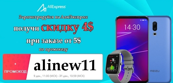 Зарегистрируйся на алиэкспресс и получи скидку в 255 руб. ($4) при заказе от 320 руб. ($5) по промокоду ALINEW11