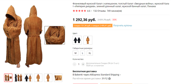 Ну и еще одна штука, о которой я пишу из разряда "лучше не покупать". Заказал вот этот халат в стиле "Звездные войны".