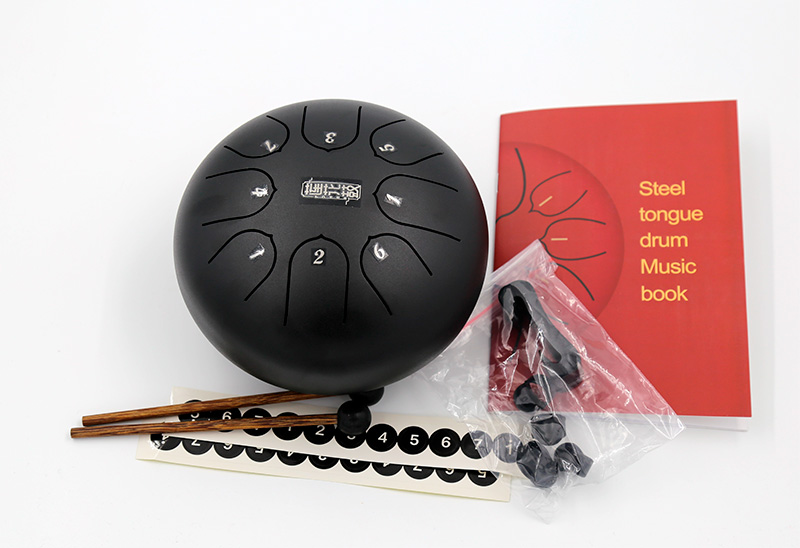 В комплекте: инструмент, две палочки с набалдашниками, насадки на пальцы рук (можно играть сразу несколькими пальцами), наклейки с номерами, книжка с парой десятков мелодий различных песен.
