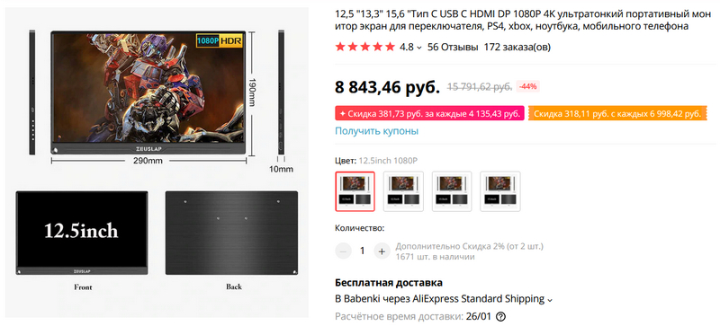 по поводу переносного монитора. купил такого же плана, только FullHD. по факту выкинутые деньги.Матрица хоть и IPS но самая дешёвая, в углах засветы. Через полчаса уже глаза начинают болеть. Чехол громоздкий и неудобен на диване и в постели. Лучше бы домиком сделали, как в айпаде. Меню трэш, пока разберёшься какие кнопки нажимать..Динамики на задней стенке а не по бокам. Соответственно самые говняные и звук как из бочки..Разъёмы плохо зафиксированны, после пары втыканий кабеля болтик который держит всю плату выломал посадочное место пришлось фиксировать клеем. Всё собрано на коленке. И самый большой косяк что при использование DEX режима идут артефакты при контрастном бело-чёрном изображение в виде продольных полос. Прод предлагает поменять кабель, но у меня другого нет. И боюсь не в этом проблема. Хлам короче. Купил на 11.11 в два раза дешевле, но и этого не стоит. Даже логотип криво приклеен. Буду открывать спор. У меня он кстати работает от любого повербанка и даже просто от телефона....то есть подключил S9 и он включился. Тускло но работал.