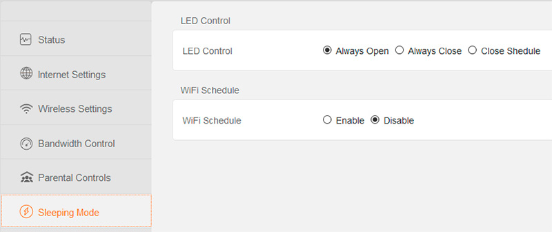 В разделе спящего режима можно выключить все LED-индикаторы, а можно их выключать по расписанию - крайне удобная опция, когда роутер стоит, например, в спальне. Также здесь можно по расписанию выключать WiFi, что, в общем-то, тоже нелишнее. И это отлично работает, я проверил.