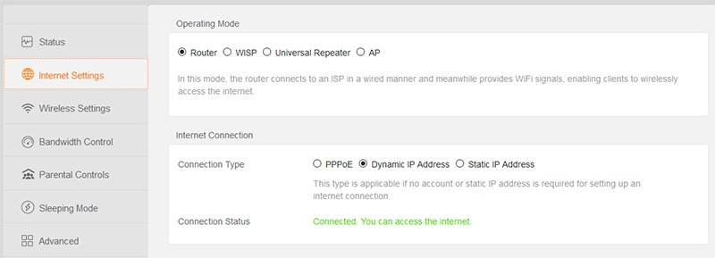 Может работать в режиме роутера, режиме  WISP (Wireless Internet Service Provider), как универсальный усилитель или просто как точка доступа.