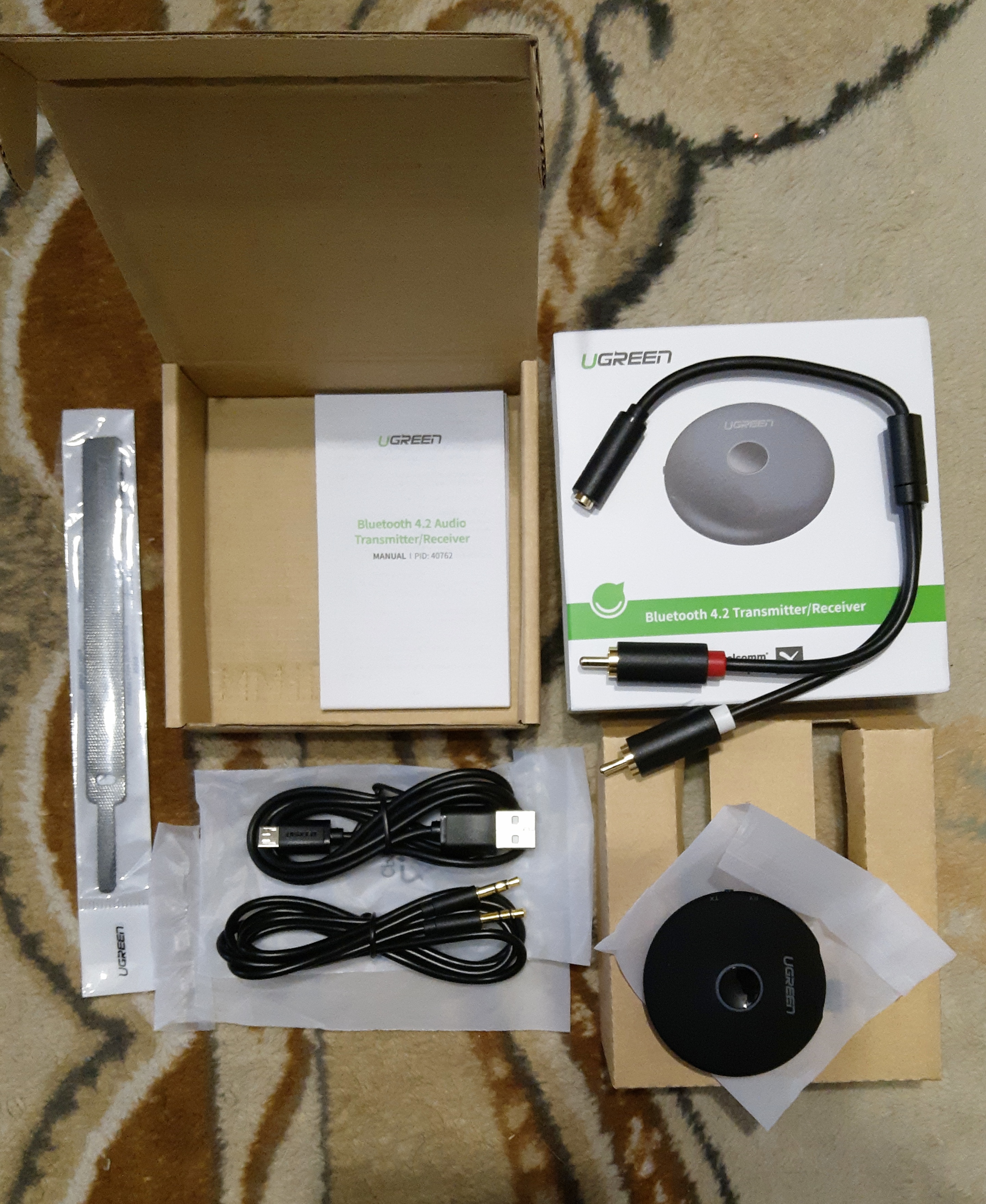Первая -- Bluetooth-ресивер, позволяющий превратить старые проводные колонки в беспроводные. Поддерживает несколько устройств, поэтому пользуюсь и с телефона, чтобы включать музыку или подкасты, и с ноутбука, чтобы провод не втыкать зря. Дальность хорошая (с другого конца комнаты ловит отлично, производитель обещает 10 метров), какой-то разницы в качестве между прямым подключение по AUX и через ресивер я не заметил. Работает по aptX, Bluetooth 5.0, на вход может брать 3.5mm AUX или RCA, питается от USB.