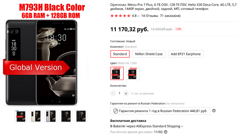 Для тех, кто не любит зря тратить деньги, а предпочитает подождать, но купить в несколько раз дешевле - на Meizu Pro 7 Plus цена упала ниже плинтуса - в пять раз! За 50 тысяч этот смартфон с двумя дисплеями (второй сзади) был несколько спорным, а за 11 тысяч - он уже бесспорный. Памяти 6/128 ГБ. Вот его обзор на мобайл-ревью.