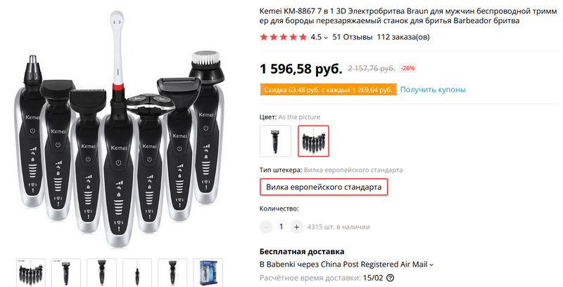Вот эта штука заинтересовала - Kemei KM-8867, заказал. Семь в одном: бритва с плавающими ножами, сетчатая бритва, триммер для носа, триммер для бороды, машинка для стрижки, помазок и даже зубная щетка. Такая зубная щетка - вряд ли удобная (моя Xiaomi Soocare X3 давно победила всех остальных конкурентов, включая дорогущую Philips), однако остальные насадки - это очень даже интересно.