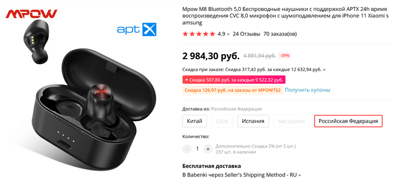 Что интересного? Поддержка apt-X, влагозащита IPX7, управление кнопочное, незавимые (могут работать по отдельности, в каждом есть микрофон), шумодав при разговоре CVC 8.0, BT 5.0. Есть доставка с российского склада.