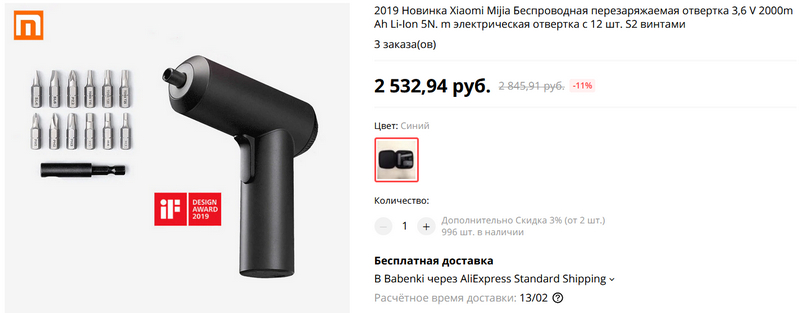 И вот эту новинку от Xiaomi заказал - беспроводная отвертка-шуруповерт. У меня икеевский шуруповерт - я его давно хочу заменить: хилый, очень быстро разряжается. Как ни понадобится - ан нет, бобик сдох, заряжай. Посмотрю как этот от Xiaomi.