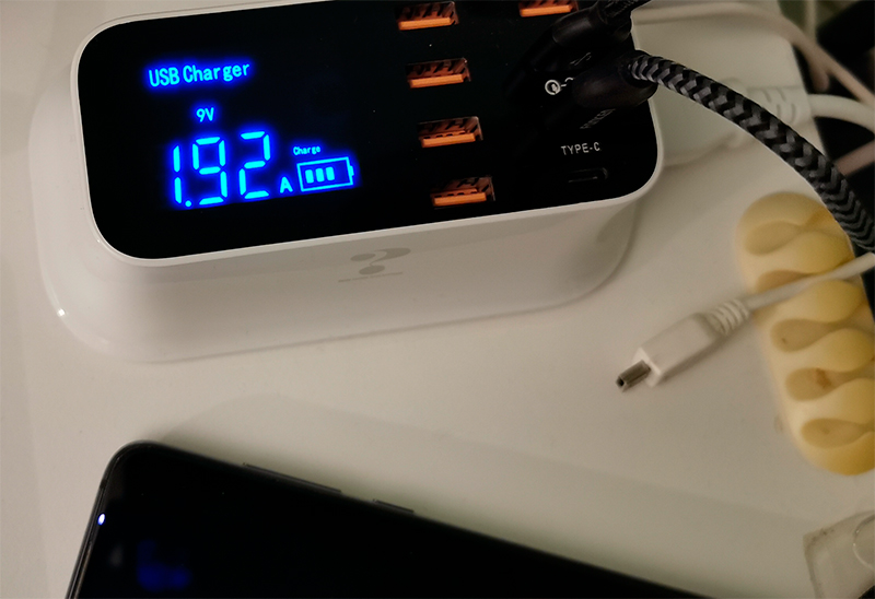 8-портовая зарядная станция, давно себе такую хотел. Есть порт с поддержкой QC 3.0 на 18 Ватт (5V/3A, 9V/2A, 12V/1.5A), общая мощность 40 Ватт, есть порт Type-C. Ну и что еще очень нравится - есть дисплей, который показывает характеристики зарядки по каждому порту.