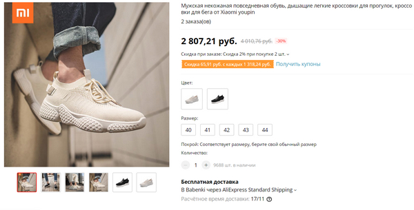 Кроссовки Xiaomi Youpin. Да-да, кроссовки. Очень прикольные. Размеры от 40 до 44, причем размеры чисто европейские: я со своим 42-м сдуру взял 43-й размер, считая, что китайцы все уменьшают, однако те были великоваты, пришлось заказывать 42-й.
