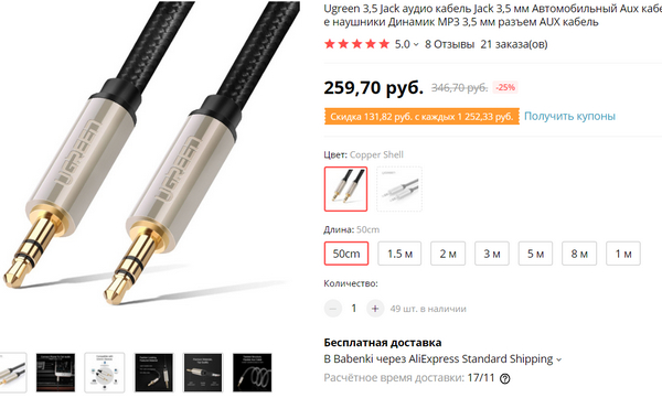 Upd: Вот хорошую штуку посоветовали - качественный аудиокабель Ugreen. Там самое главное - размеры самые разные: от 50 см до 8 метров.