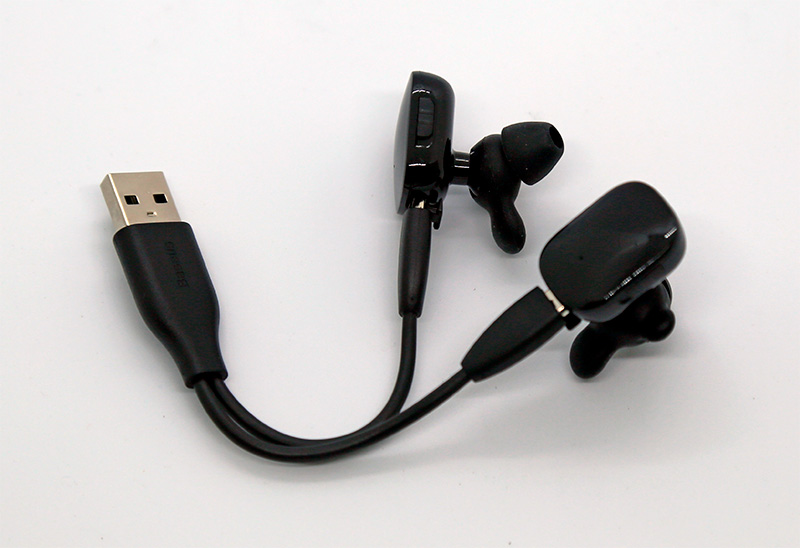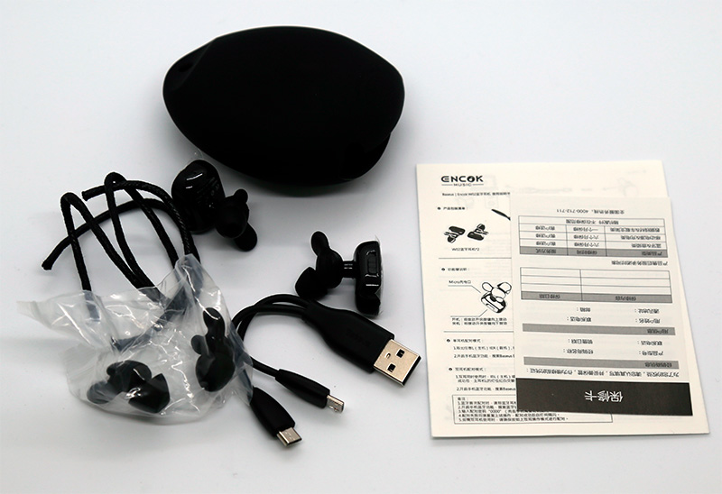 Комплектация: наушники, запасные амбушюры, зарядный кабель, чехол, веревка для чехла, инструкция на китайском. Да-да, зарядного кейса тут нет, наушники имеют порты microUSB и заряжаются от приложенного двойного кабеля. Решение вполне понятное, наушники не такие маленькие, кейс для них был бы достаточно громоздкий.