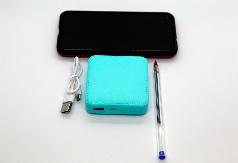 Вход/выход - 5В/1A. Материал - пластик, но с текстурой (и прострочкой) под кожу. Вот фото для оценки размеров. Очень компактная, чем и понравилась. Вес - 200 граммов.