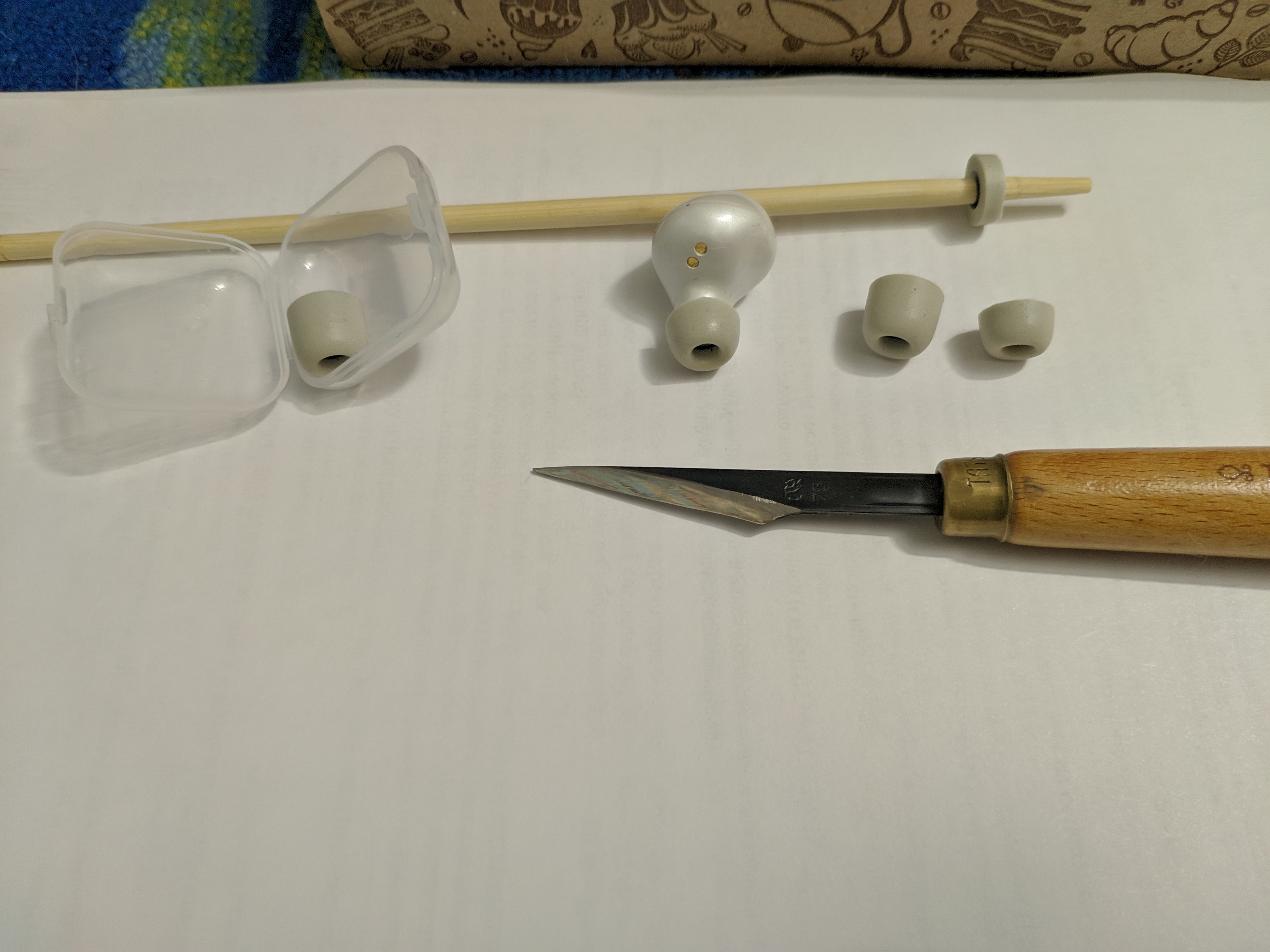 Кстати, если взять круглую палочку и острый нож, то можно их ровно подрезать для TWS наушников. Я такие амбушюры ношу, например, с такими наушниками (стоковые - полное барахло), в кейс все входит, обрезается 1,5-2 мм.