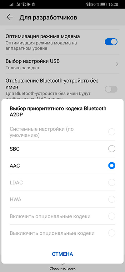 Не может быть такое качество по SBC, сказал я, и полез в раздел для разработчика смотреть кодеки. Ну и, как и предполагал - это AAC - он тут поддерживается, причем это вроде как даже и не заявлено (хотя на Aliexpress часто бывают неточности в описаниях).
