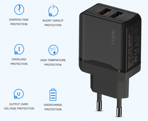 Один порт - QC 3.0 до 18 Ватт, второй - до 12 Ватт. Годится.