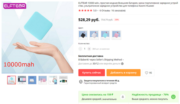 Симпатичная и компактная аккумуляторная батарея на 10000 мАч. Совсем недорогая. Есть различные цвета.