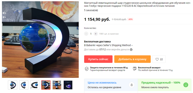 Левитационный глобус. 1371 рубль. Это мы увидели у друзей, ребенок тоже попросил купить. Я заказал, люблю такие штуки.
