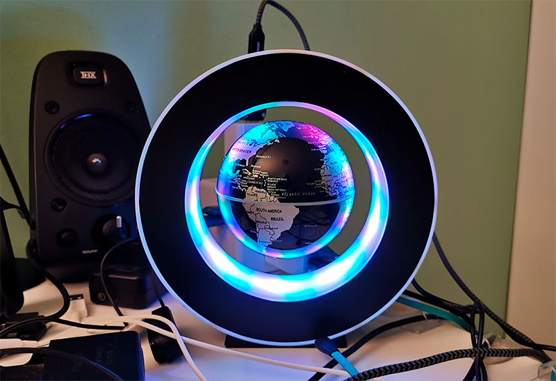 Получили, включили. Сначала было не очень понятно - глобус просто примагничивается к верху кольца. А летать-то как, в чем смысл?