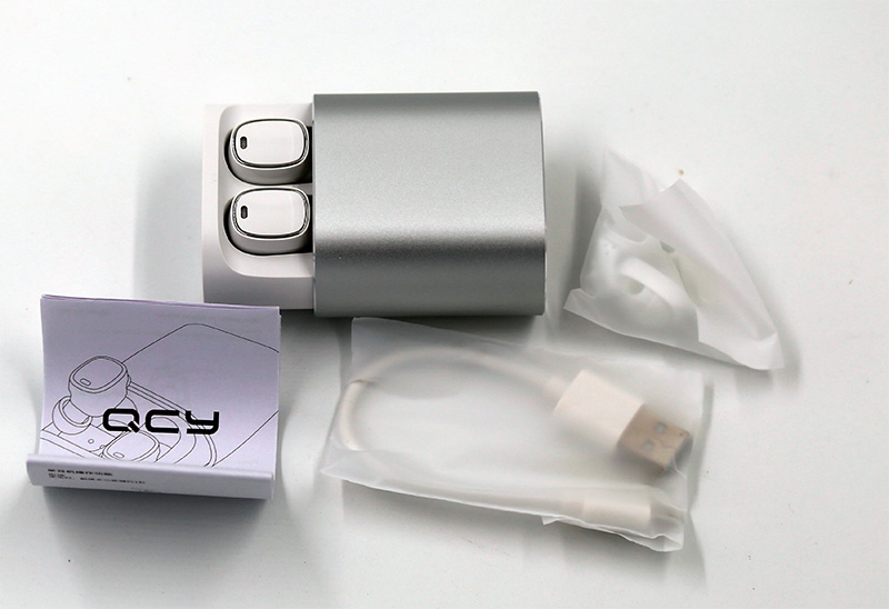 В комплекте: наушники, зарядный кейс (алюминий), еще две пары амбушюр и крючков, кабель для зарядки, инструкция. В результате в комплекте мы имеем три пары амбушюр: маленькие, средние, большие, и три пары крючков: маленькие, средние, большие. Все это можно комбинировать как угодно - например, маленькая амбушюра и самый большой крючок. То есть можно подобрать под индивидуальное строение уха.