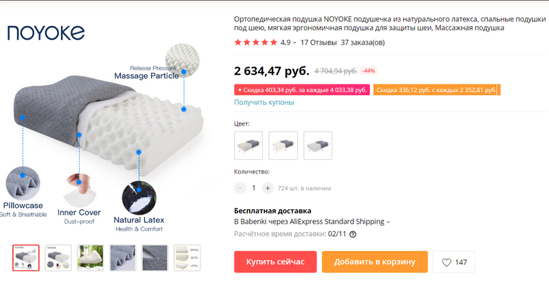 На Ali сначала натолкнулся вот на такую подушку из латекса - массажную. 2634 рубля. Там три варианта, заказал самую мощную, с крупными выступами.