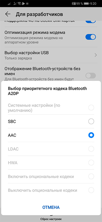 Кроме того, выяснилось, что эти наушники поддерживают AAC - смартфон позволял переключаться между SBC и AAC. Впрочем, особой разницы между их звучанием я не заметил - на обоих кодеках наушники звучали очень хорошо.
