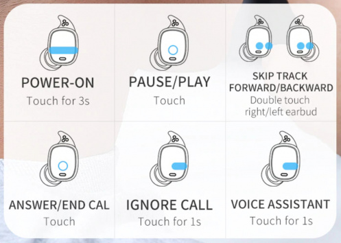 Управление наушниками - стандартное сенсорное, регулировка громкости не поддерживается. Вот схема управления.