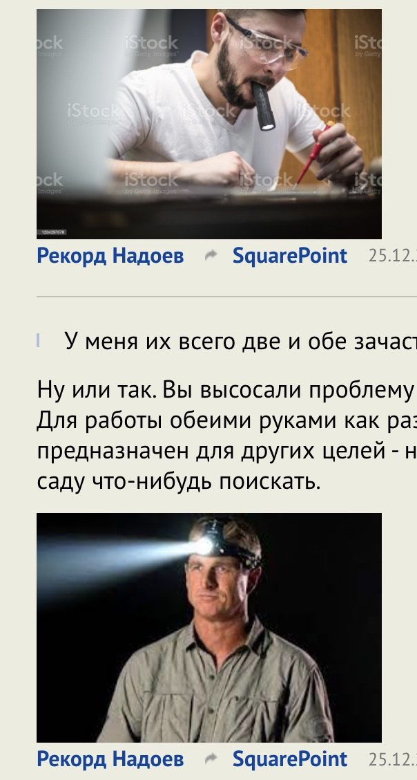 Для работы обеими руками как раз "налобные" фонарики и сделаны, а тот, что у Богдана, предназначен для других целей - например, подсветить себе под ноги в пути, или в темном саду что-нибудь поискать.