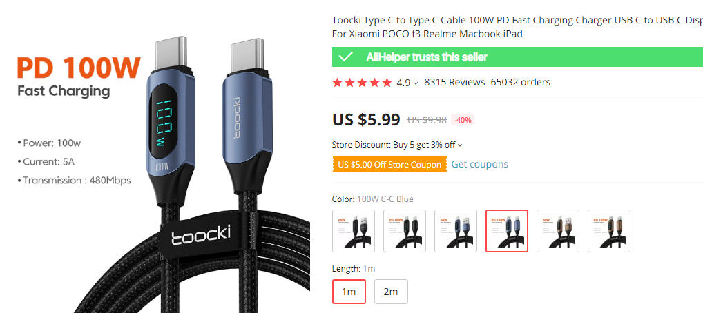 Toocki 140W GaN Charger. Именно всё как было заявлено: пять портов, общая мощность аж 140 ватт, три Type-C до 100 ватт, три Type-A до 65 ватт, свой кабель, дисплей с мощностью, подставка, кабель.