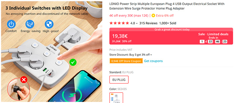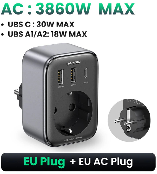 Интересный тройник, он же адаптер питания. Совсем короткий кабель, оставляющий для тройника определенную степень свободы, две евророзетки, USB-A с QC до 18 Вт, Type-C с PD до 20 ватт, два USB-A на 12 ватт. Причем у каждой розетки и блока USB-портов свой выключатель (как вариант - защита от маленьких детей: для розетки, в которую ничего не воткнуто, питание отключается). Мне такой нужен, заказываю.