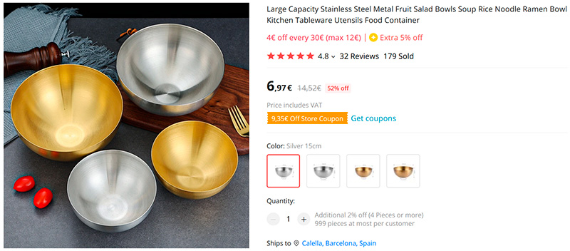 Серебристые и золотистые салатницы из нержавеющей стали двух размеров: 15 и 20 см. И для повседневного использования, и для эффектной подачи салатов для гостей на праздничный стол. Возьму себе серебристый 20-сантиметровый, а то у меня вечно листья салата из глубокой тарелки вываливаются. При этом делать салат в пластиковой миске - не люблю.