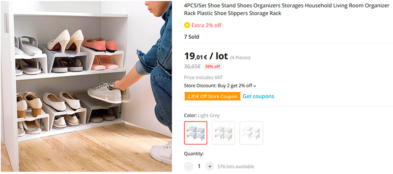 Комплект из четырех пластиковых подставок для обуви, позволяющих разместить в два раза больше пар обуви в ограниченном пространстве. Три варианта цветов.