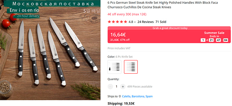 P.S. Лишний раз напоминаю, что когда цена очевидно слишком низкая, сразу смотрите на стоимость доставки. Все вместе - и будет нормальная цена. Такое у китайцев бывает. Можно найти эти же ножи за €47 с бесплатной доставкой.