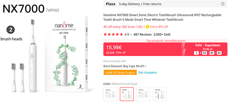 Электрическая вибрационная зубная щётка Nandme NX7000. 5 режимов работы: чистка, полировка, отбеливание, уход за дёснами и чувствительными зубами. 3 режима интенсивности. Голубого и белого цвета, есть комплект с 2 дополнительными головками, есть вариант с 12 дополнительными головками.