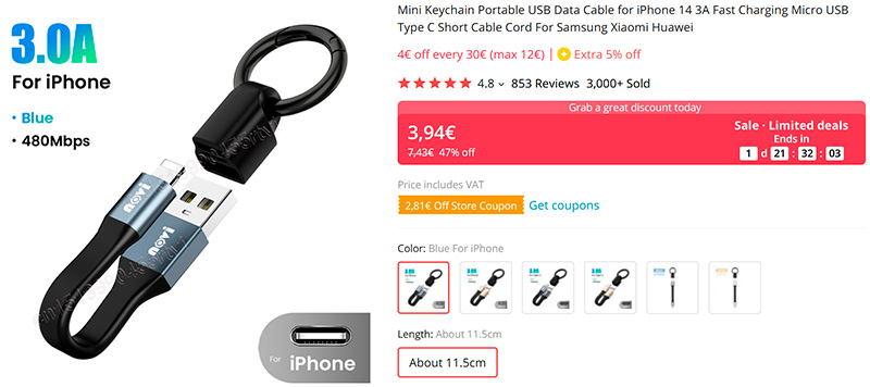 В нужный момент не оказалось под рукой зарядного кабеля, грусть-печаль? Чтобы избежать подобных случаев, заведите маленький зарядный кабель в виде брелока для ключей. Для заказа доступны все виды портов - Lightning, Type-C и microUSB, - и два варианта цветов для каждого порта.