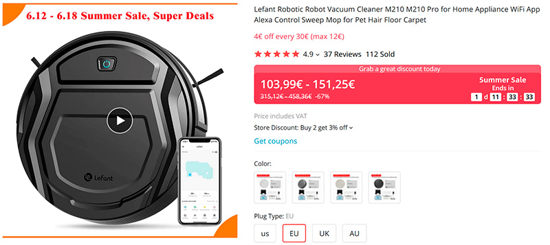 Пошел смотреть, что там вообще предлагается - Lefant M210. Диаметр корпуса 28 см, высота 7 см. Две боковые щетки (но нет турбощетки), датчики падения с лестницы, в автоматическом режиме движется не хаотично, а проходит все помещение змейкой. Причем робот даже ухитряется строить карту помещения (очень приблизительную) в приложении Lefant Life (а он без камеры и тем более без лидара). Есть голосовое управление. К нему можно докупить тряпочку с насадкой, и он будет дополнительно протирать пол. Отзывы очень приличные, но при этом обозреватели предупреждают, что не стоит ждать чудес от робота за €100. Но свои деньги он отрабатывает на все сто. На все сто евро.