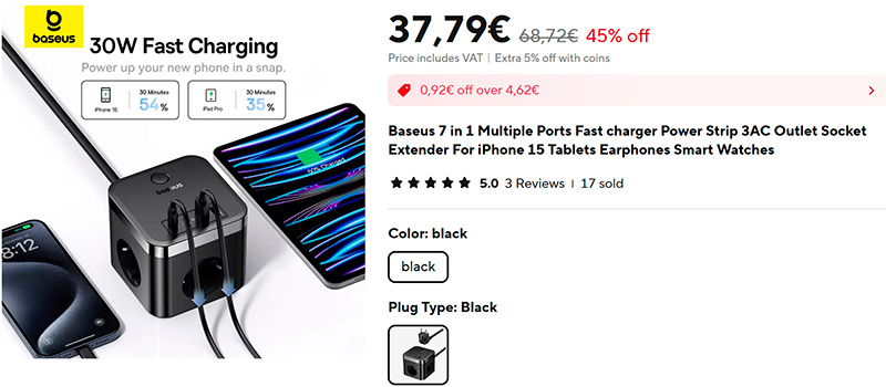 Удлинитель, тройник, 2 порта USB-A и 2 порта Type-C суммарной мощностью в 30 Вт - устройство "7 в 1" от Baseus (для РФ - 1862 руб).