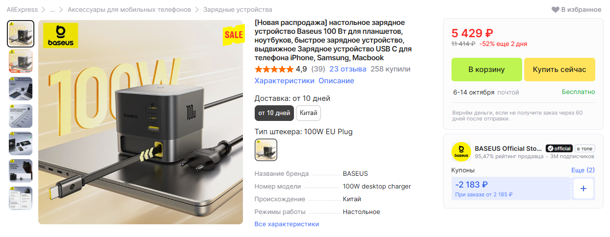 Настольное зарядное уcтройство от Baseus на 100 Вт.