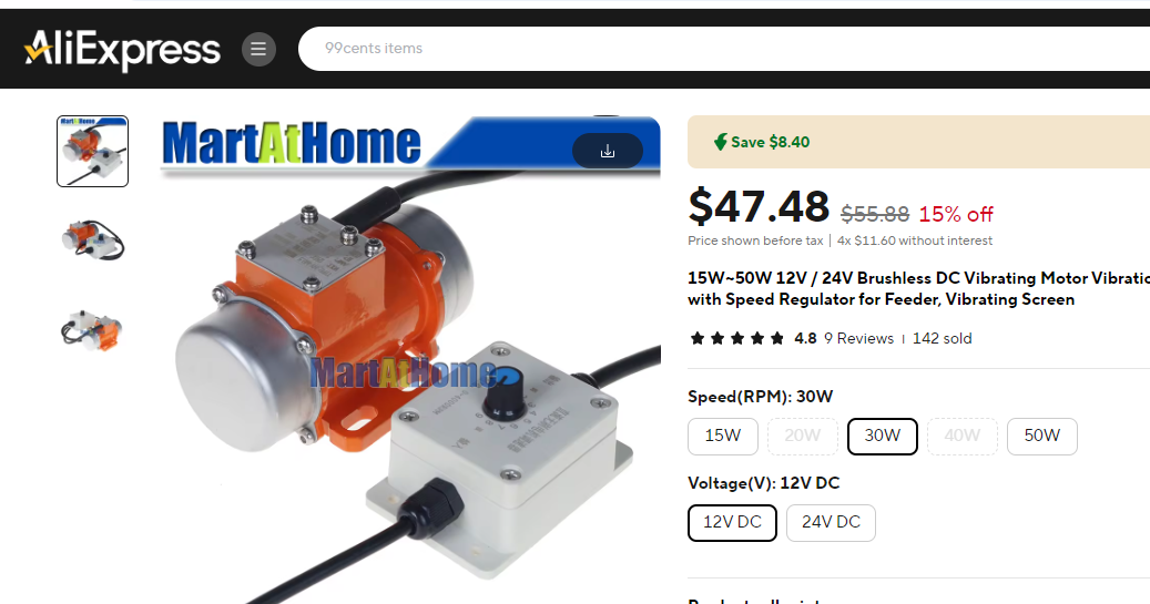 Mотор-вибратор на 30W и 12V, с регулятором скорости, покупал на Aмазоне (один в один) за те же деньги. Алиекспресс сломался, несите нового. Амазон прислал за 2 дня.