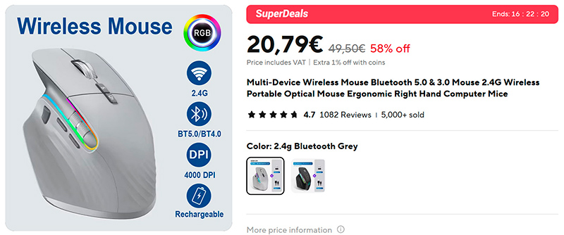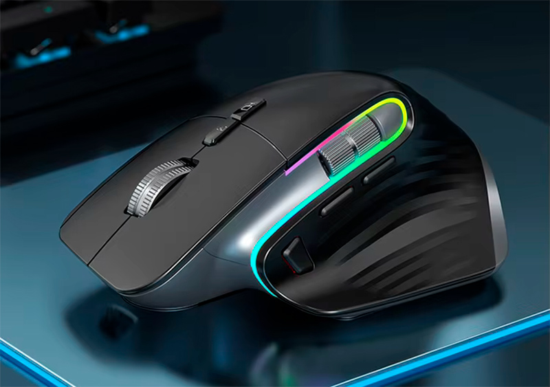 Очень интересный вариант продвинутой эргономичной мышки (ссылка для РФ), создатели которой явно вдохновлялись мышкой Logitech MX Master 3. Все виды подключений: Bluetooth 5.0, по беспроводному адаптеру, по проводу. Заряжается через USB-порт, имеет RGB-подсветку с 12 видами эффектов, поддерживает несколько разрешений, вплоть до 4000 DPI, 6 управляющих кнопок. Два варианта цветов. Инерционного колесика как у Logitech вы здесь не получите, но в остальном выглядит очень интересно, заказал себе потестировать.