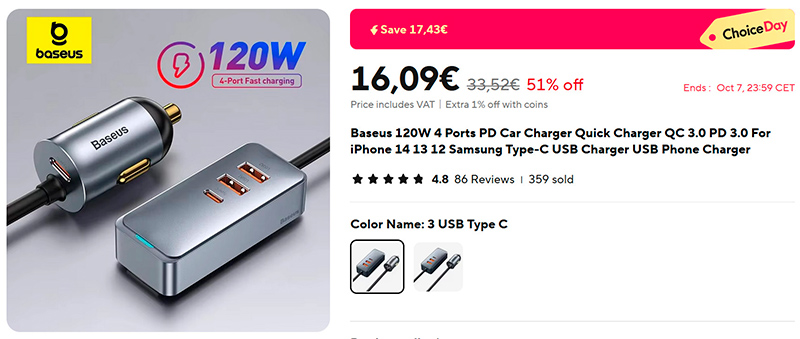 Если у вас в машине на заднем сиденье кто-то ездит (например, дети), а сзади нет портов для зарядки смартфонов, то тогда вам очень пригодится вот такая полезная штука (ссылка для РФ) - автомобильный адаптер аж на 120 Вт для прикуривателя: один порт для зарядки в прикуривателе (на выбор - USB-A или Type-C), три порта для зарядки на удлинителе.