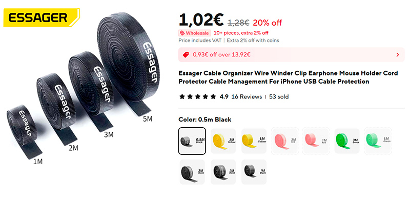 Многоразовые нейлоновые стяжки-липучки (ссылка для РФ) для кабелей от Essager - для организации болтающихся проводов. Не знаю, насколько будут востребованы цветные варианты, а черную стяжку в метр-два я периодически покупаю, ее удобно использовать, тем более что нужный размер конкретной части ты определяешь сам и просто отрезаешь столько, сколько тебе нужно.