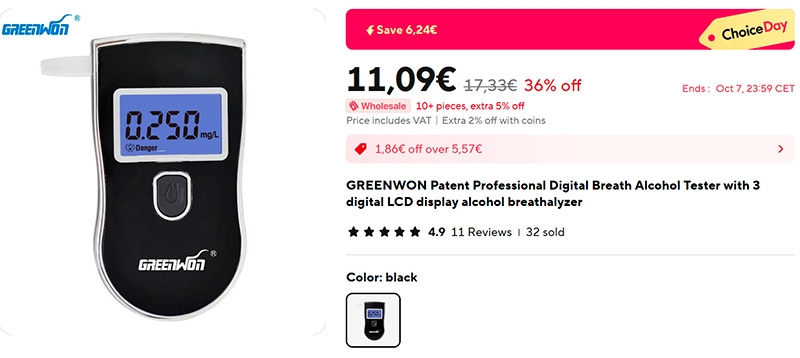 Удобный алкотестер Greenwon (ссылка для РФ) - компании, которая специализируется на алкотестерах. Я именно эту модель использую года три. Она сразу выдает результат в нужных величинах - мг/л, а у меня были модели, которые по умолчанию выдавали другие единицы и нужно было переключать.