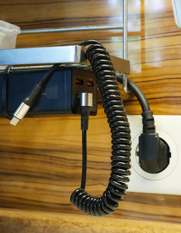 Брал для использования с блоком питания, закреплённого над столом (см фото). Оказался очень практичным и аккуратным решением, ибо эластичный (от 35 до 60+ см), не валяется по столу и его не нужно сматывать-разматывать вручную при подключении устройства, при этом нет риска случайно выдернуть его из блока при перемещении устройства по столу.
